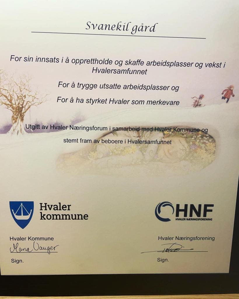 10ende generasjonen på Svanekll Gård ble idag «tatt på senga» og vant den prestisjetunge prisen «Næringsprisen på Hvaler» i 2021. En veldig jevn avstemning mellom de flinke andre aktørene Hollungen v/Petter Parmer, @hvalergjestgiveri v/Elgheim og Martin J.Holter. Tusen takk til alle som har stemt på oss. Det setter vi veldig stor pris på, og gir oss en skikkelig vitamininnsprøyting i vårånna. Imorgen er det fult kjør igjen.